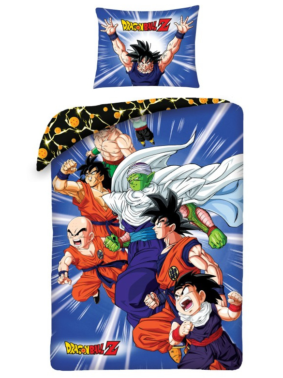Die Hauptfiguren des japanischen Anime Dragon Ball Z auf angenehm weicher Bettwäsche für Kissen und Bettdecke.