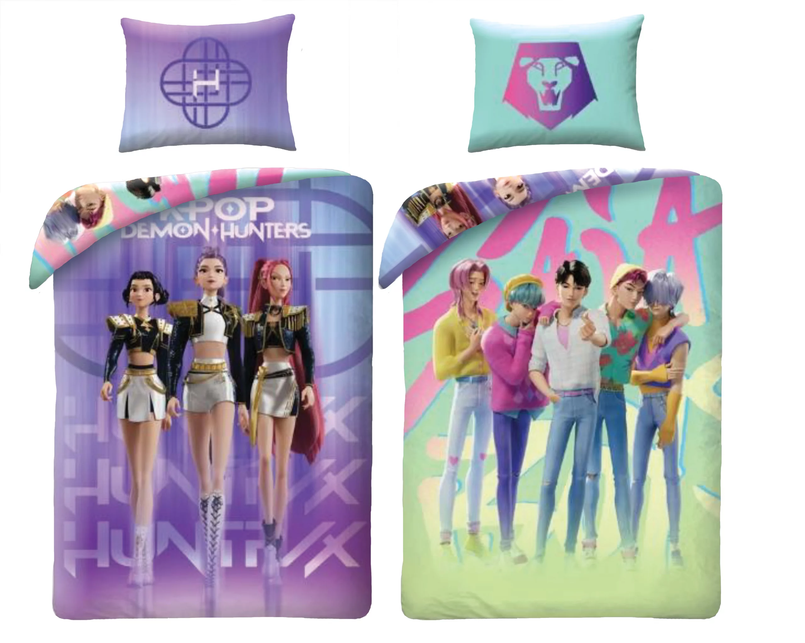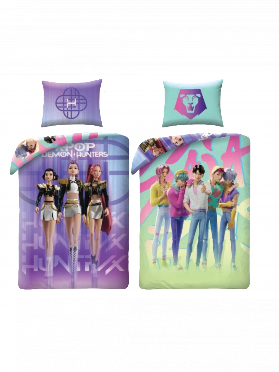 Zwei Welten, eine Stage. Die Bettwäsche KPop Demon Hunters – KPop/Saja vereint die Idol-Energie von Huntrix mit dem Charisma der Saja Boys in einem ausdrucksstarken Design, das jedes Zimmer zum Strahlen bringt.