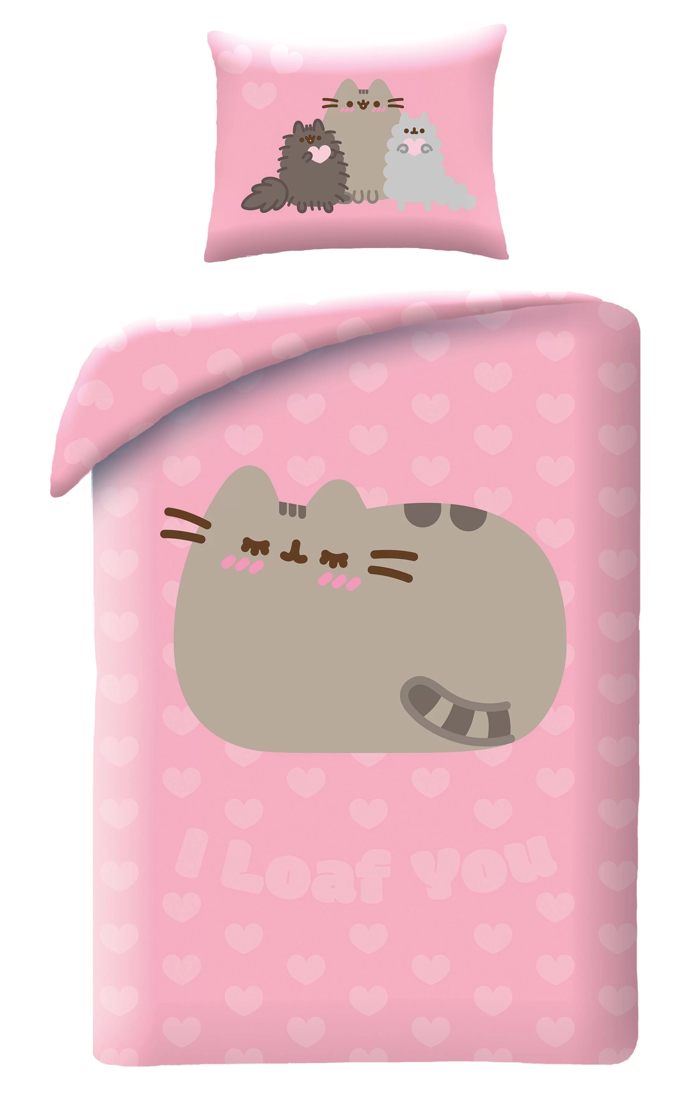 Das rosa Motiv mit Pusheen als Brotlaib und kleinen Herzen bringt Freude in jedes Schlafzimmer und zaubert ein Lächeln vor dem Einschlafen und nach dem Aufwachen.