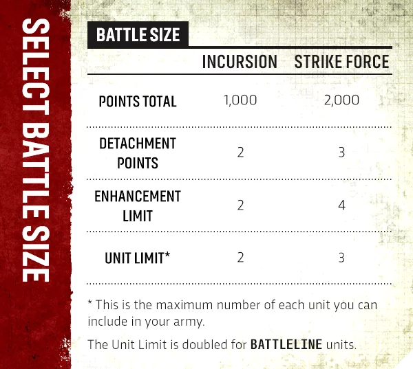 Die 11. Edition kommt mit einem neuen System zu Armeezusammenstellung - den sog. Detachment Points. Je nach Spielgröße könnt ihr eine bestimmte Anzahl an Detachments wählen, basierend auf ihrem Preis in Detachment Points. Diese reichen von 1 Punkt bei Detachments mit lockeren Regeln oder enger Spezialisierung auf bestimmte Einheiten bis hin zu 3 Punkten bei solchen, die eure gesamte Armee mit starken Boni beeinflussen.