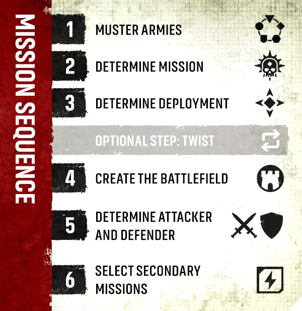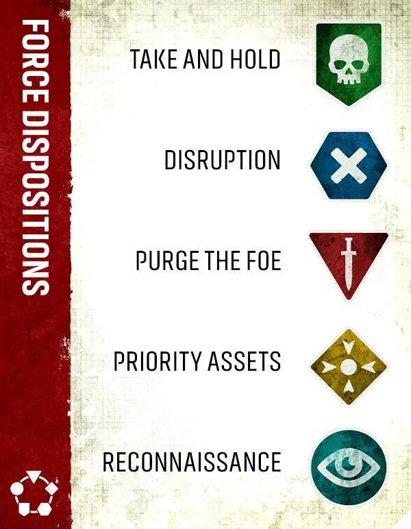 Basierend auf euren eigenen und den Force Dispositions eurer Gegner bestimmt ihr die Missionen, die ihr spielen werdet. Bei Turnieren wird in der Regel eine einzige Force Disposition gewählt, die für das gesamte Event gilt. Insgesamt stehen 25 Missionen zur Verfügung – jeweils 5 für jede Force Disposition.