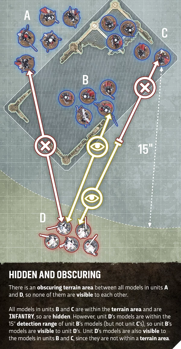 Neu ist die Regel Hidden (Versteckt). Infantry-, Beast- und Swarm-Modelle innerhalb von Terrain Areas bleiben Hidden, solange ihre Einheit in diesem oder dem vorherigen Zug nicht geschossen hat. Hidden-Modelle sind für Gegner nur sichtbar, wenn sie sich innerhalb ihrer Detection Range befinden, die in der Regel 15" beträgt. Dadurch können sich Einheiten in den ersten Runden im Gelände verstecken, ohne sofort Beschuss von der anderen Seite des Spielfelds befürchten zu müssen.