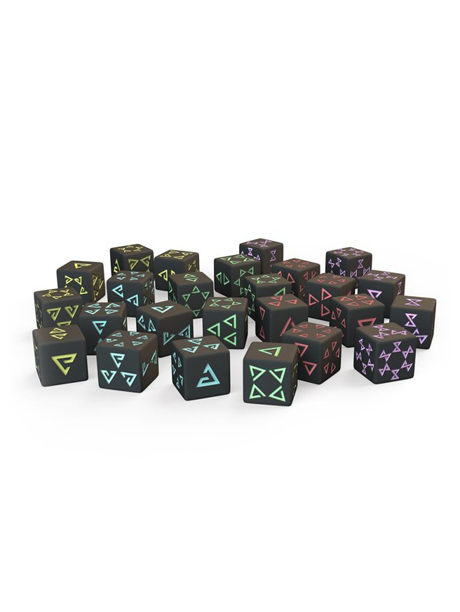Zusätzliche 25 Würfel für mehr Komfort beim Spielen des Brettspiels The Witcher: Old World. Es handelt sich um insgesamt 5 Würfelsätze, sodass jeder Spieler sein eigenes Set haben kann. Die Würfel sind mit den Hexerzeichen geprägt und haben unterschiedliche Farben. Sie werden beim Würfelpoker und bei einigen Karten verwendet.