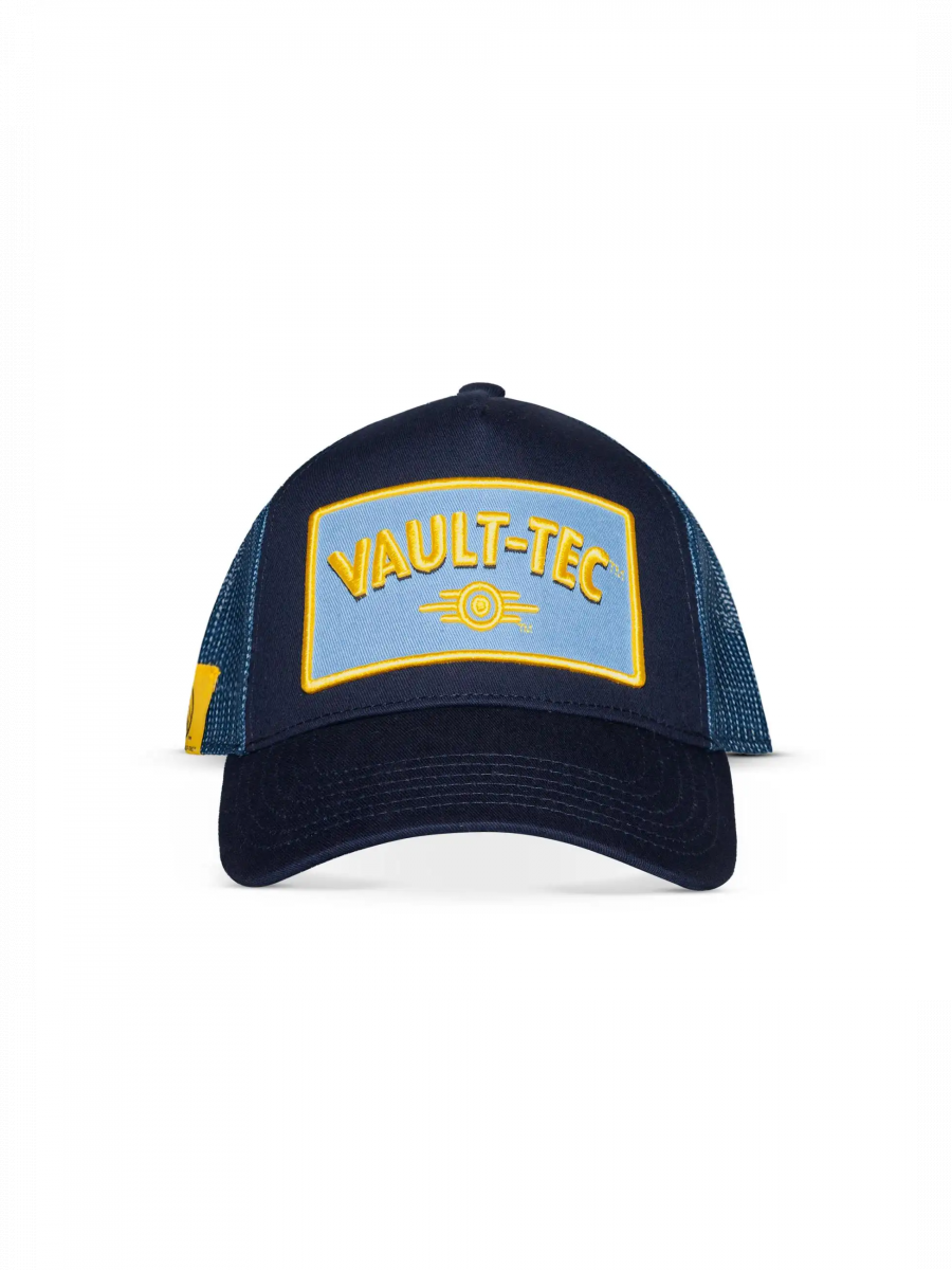 Überlebe das Ödland mit Stil! Diese blau-gelbe Trucker-Cap mit dem Vault-Tec-Emblem ist die perfekte Wahl für alle, die sofort ins Vault rennen würden.