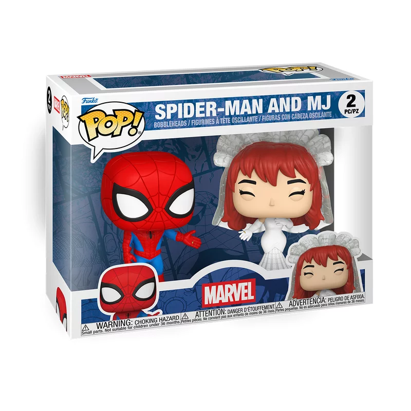 Spider-Man im klassischen Kostüm und MJ im eleganten Hochzeitsoutfit bilden einen perfekten Kontrast, der sofort ins Auge fällt. Die detailreiche Verarbeitung und der typische Funko-Stil machen dieses 2-Pack zu einem echten Highlight in jeder Sammlung.