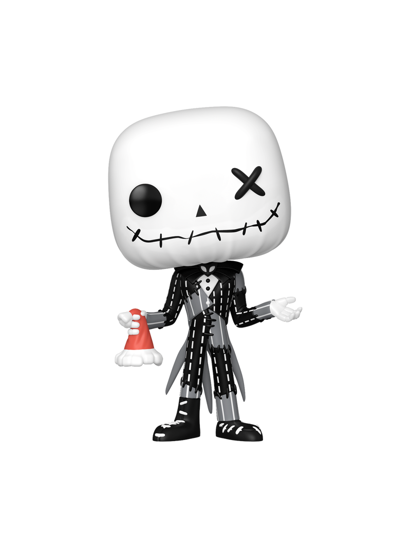 Die Funko POP!-Figur von Jack Skellington aus The Nightmare Before Christmas zeigt den legendären Halloween-König in seinem typischen gestreiften Anzug, diesmal mit einer Weihnachtsmütze in der Hand.