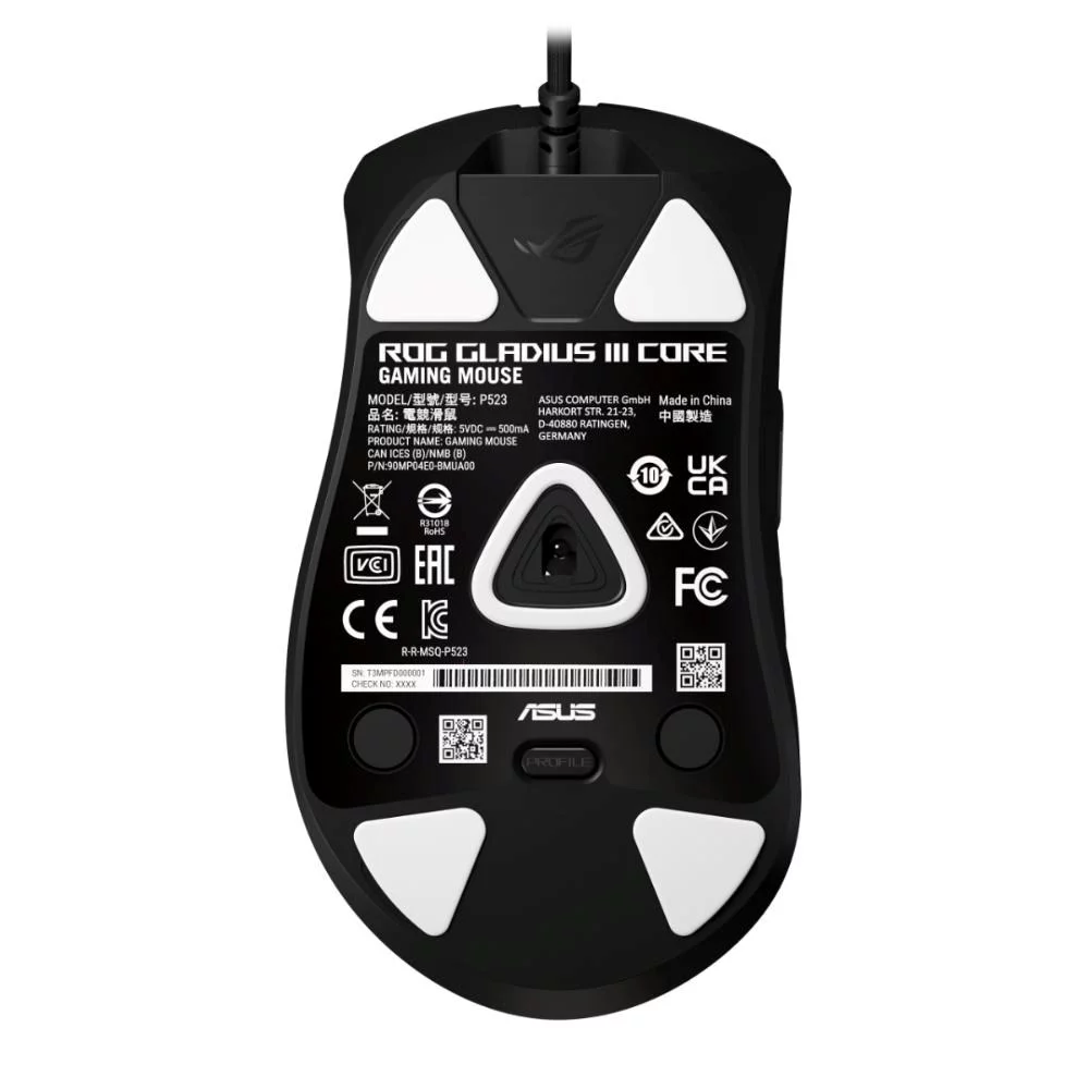 ROG Gladius III Core ist eine 72 Gramm leichte kabelgebundene Gaming-Maus mit ergonomischer Form. Sie ist mit einem optischen Sensor mit einer Auflösung von 12.000 dpi, ROG Micro Switch II-Schaltern, ROG Push-Fit Switch Sockets, einem ROG Paracord-Kabel sowie 100 % PTFE-Gleitpads ausgestattet.