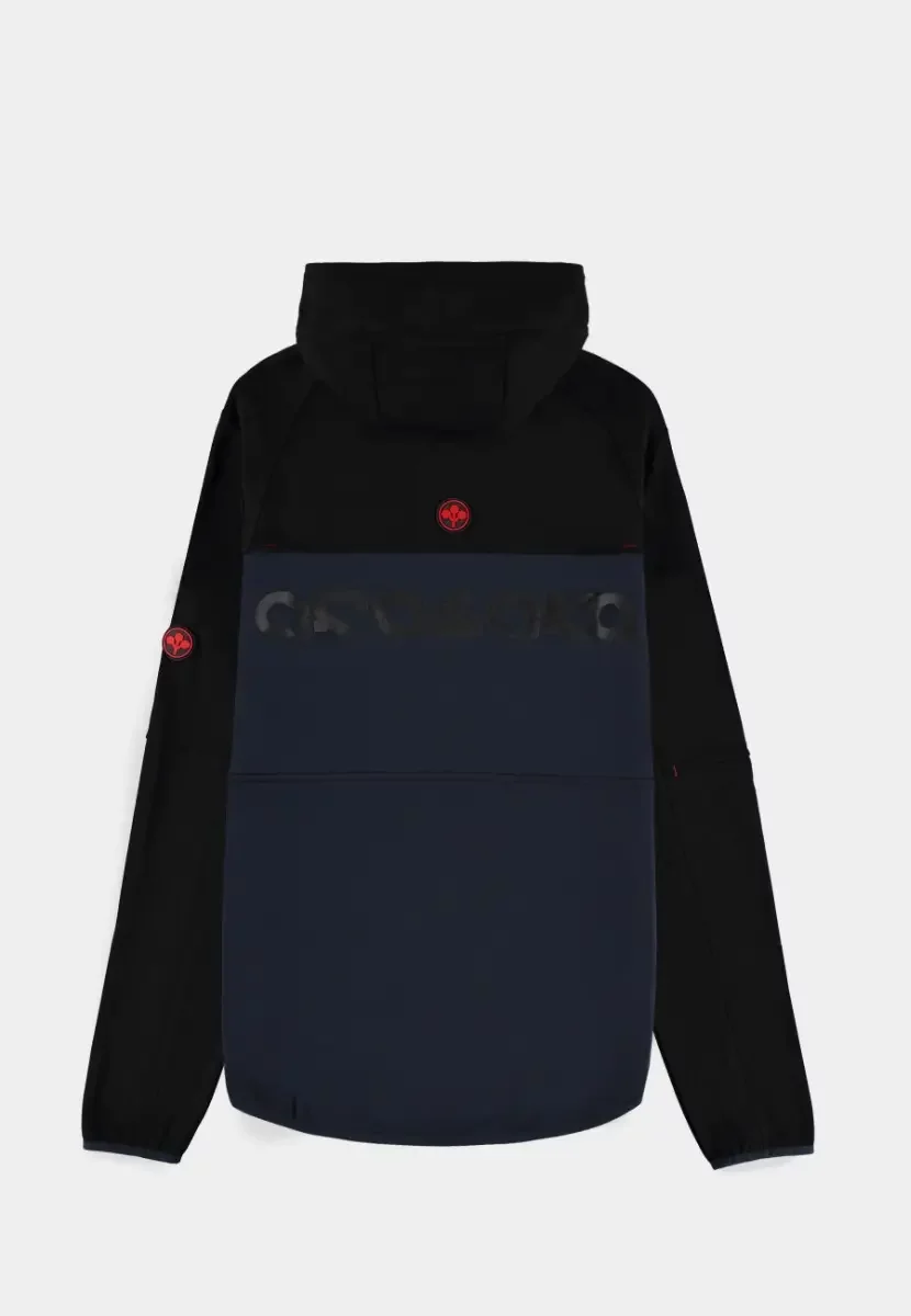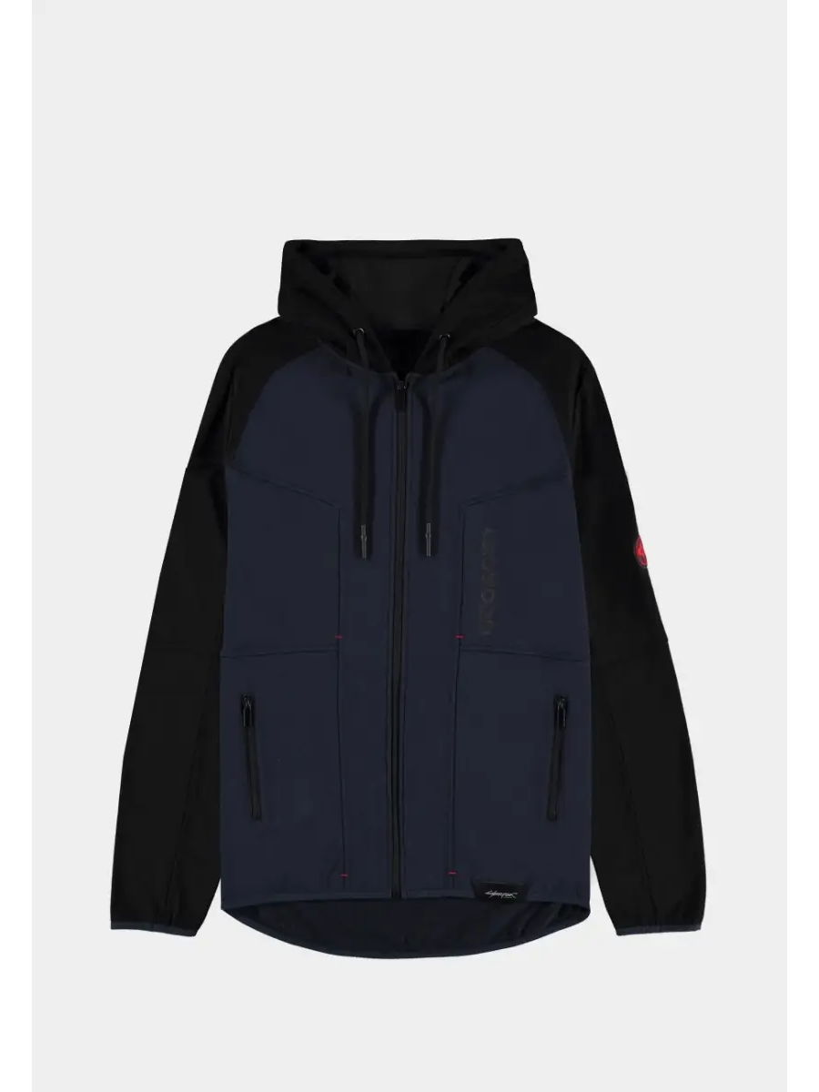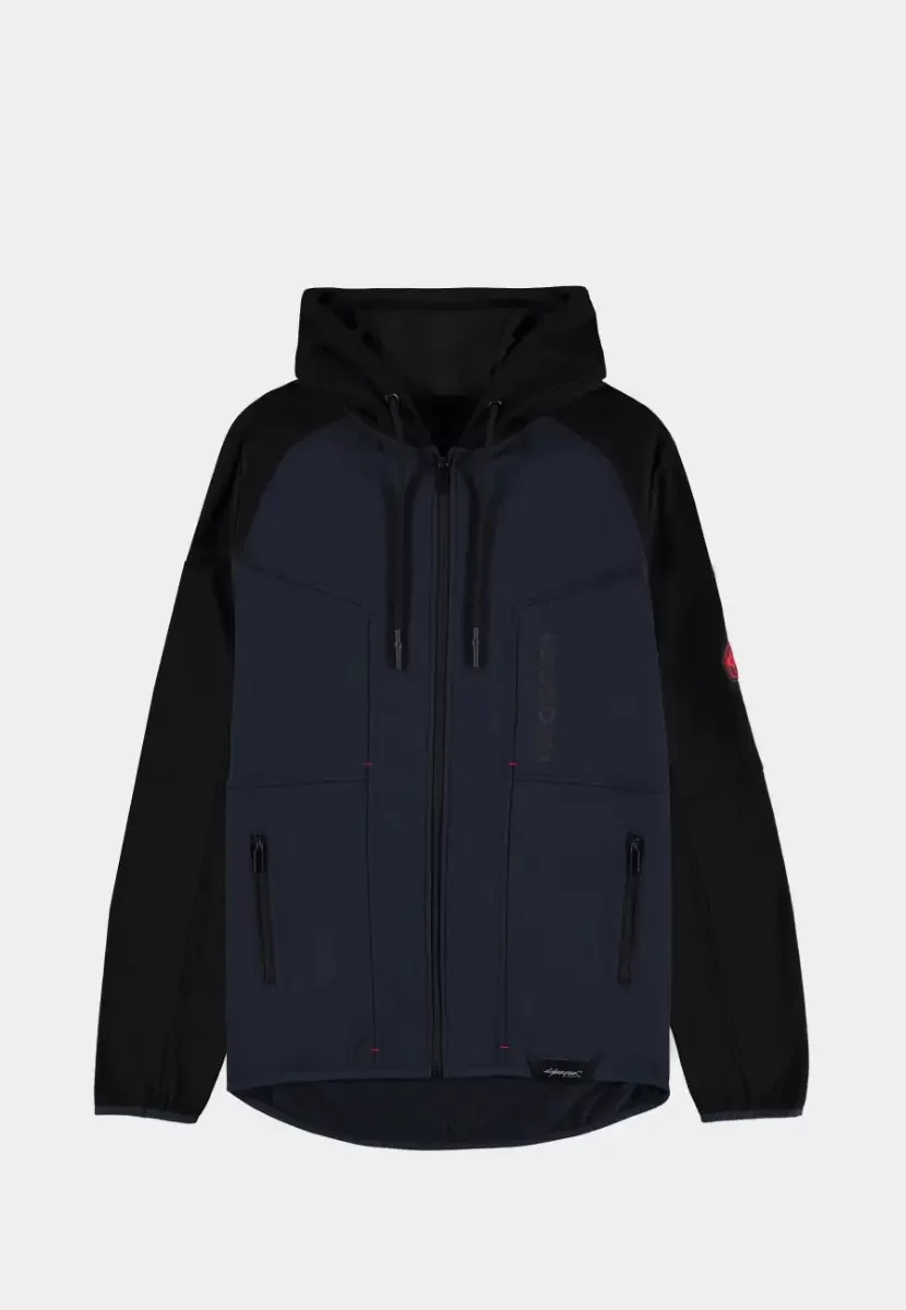 Das Cyberpunk 2077 – Arasaka Hoodie kombiniert schwarze und dunkelblaue Paneele mit einem dezenten Arasaka-Logo auf dem Rücken und am Ärmel. Der funktionale Schnitt mit Reißverschluss, Kapuze und Taschen macht es zur idealen Wahl für Fans einer Welt, in der Megakonzerne herrschen.