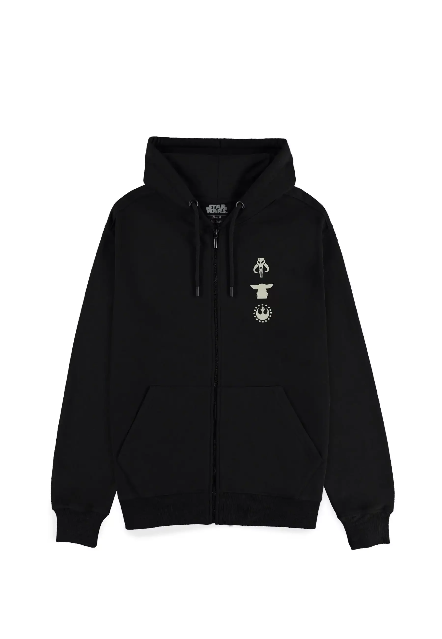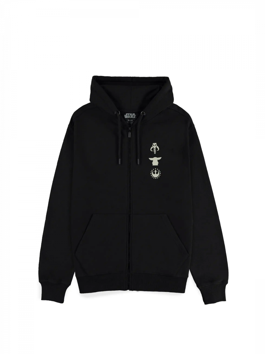 Der bequeme Schnitt, der Reißverschluss und die praktische Kapuze machen ihn zum idealen Kleidungsstück für den Alltag. Die stilvolle Kombination aus dezentem Design auf der Vorderseite und auffälligem Motiv auf dem Rücken macht ihn zur perfekten Wahl für jeden Kopfgeldjäger.