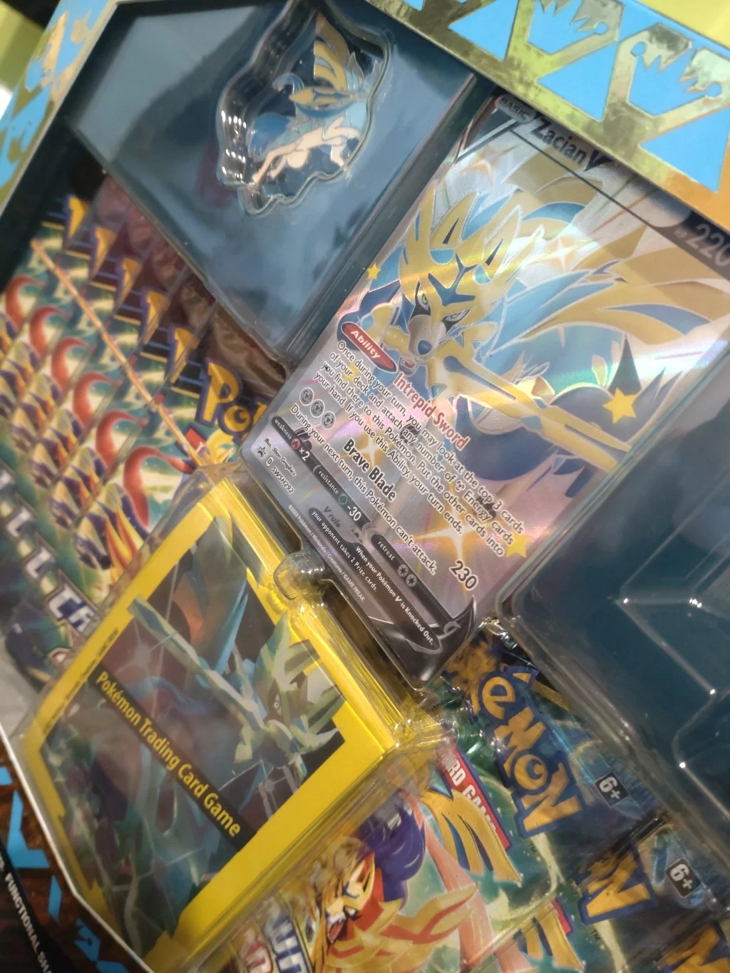 In diesem speziellen Paket Crown Zenith Premium Figur Collection finden Sie eine große Figur von Shiny Zacian, Booster-Packs zur Erweiterung Ihrer Sammlung, eine Promo-Karte, einen Sammler-Button, Hüllen für die Karten und einen Code für Pokemon TCG online.