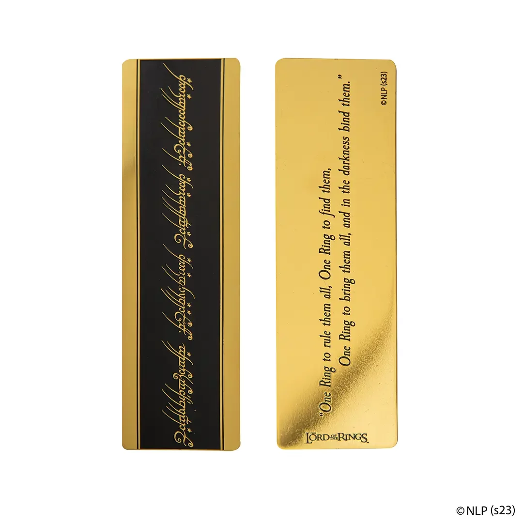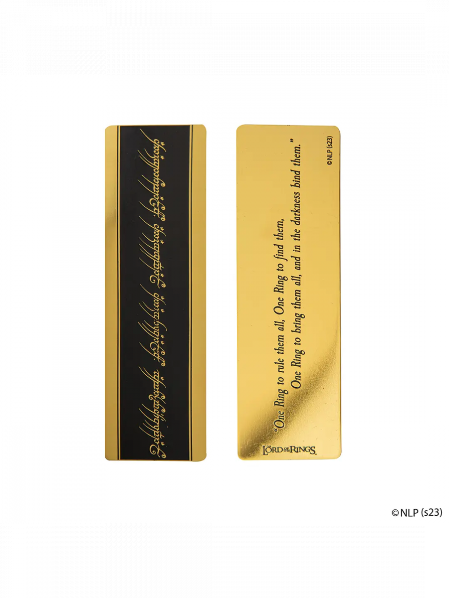 Elegantes Metall-Lesezeichen, inspiriert von Der Herr der Ringe, verziert mit der ikonischen Inschrift des Einen Rings in schwarzer Sprache.