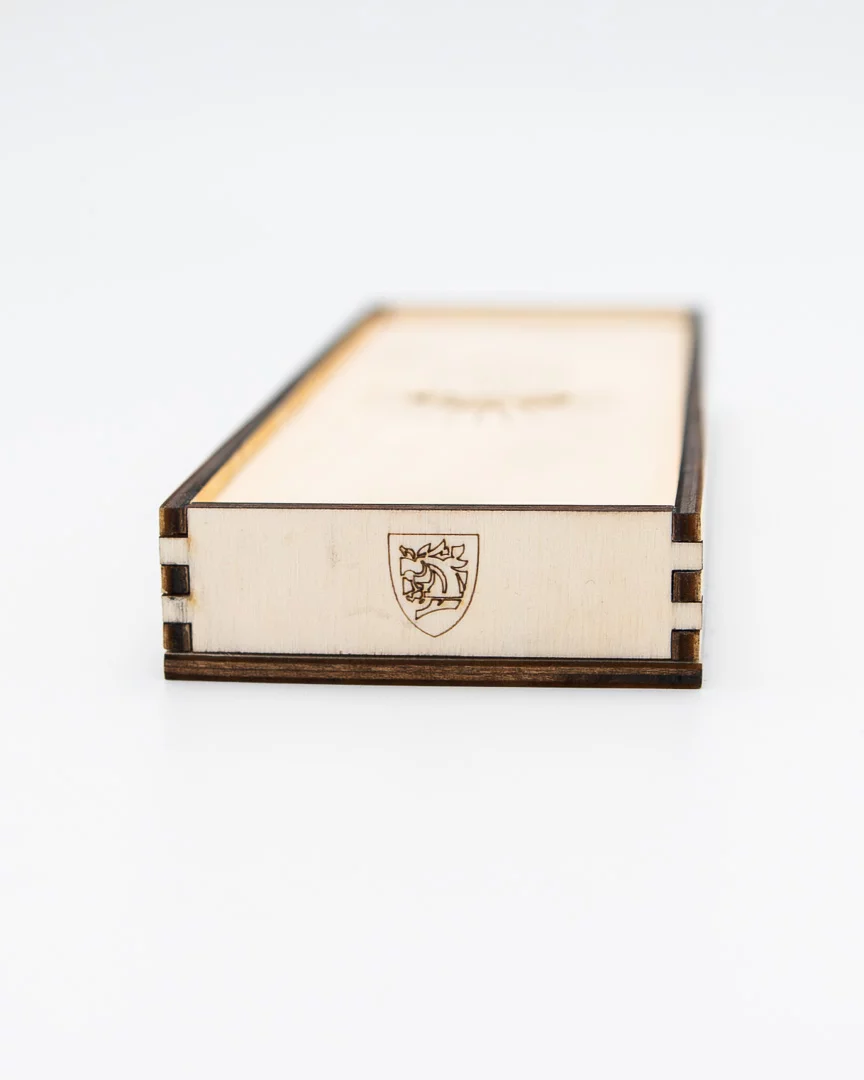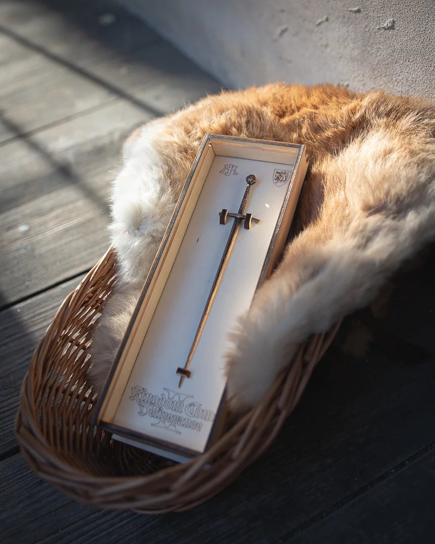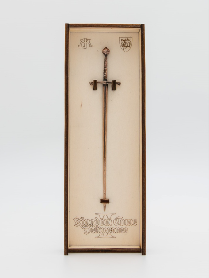 Jedes Stück ist ein Unikat und erinnert mit seinen kleinen Abweichungen an die Handarbeit eines mittelalterlichen Schmieds. Das Schwert ist in einer eleganten Holzbox untergebracht, in der es an Haken hängt – genau wie in Heinrichs Schmiede aus dem DLC Odkaz kovárny (Forge Legacy). So präsentiert, wirkt es wie eine Szene direkt aus dem Spiel und erinnert an das wichtigste Symbol der gesamten Serie.Abmessungen: Länge ca. 150 mm (jedes Schwert ist ein Unikat und variiert daher leicht in Gewicht und Größe)