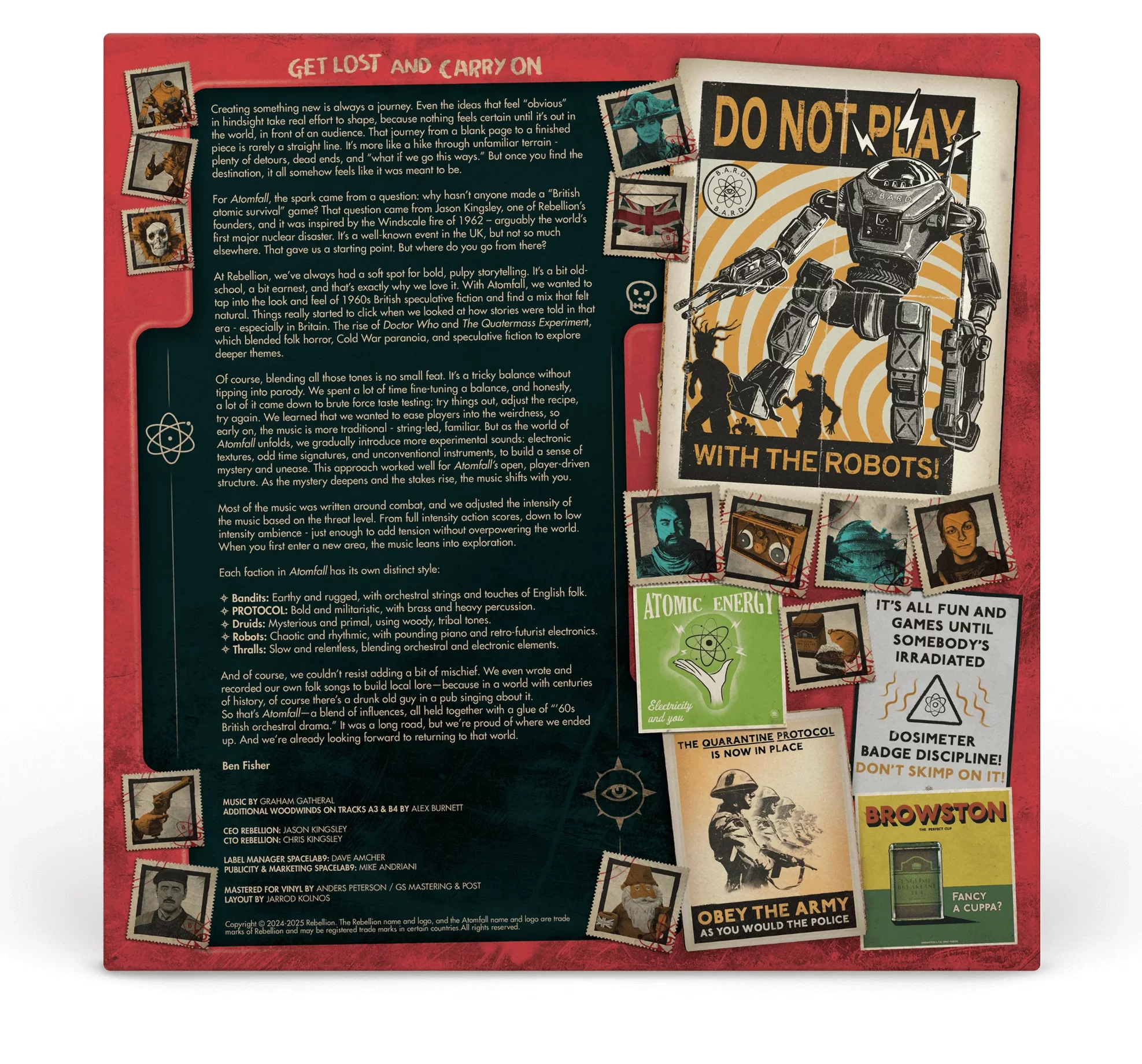Die limitierte Vinyl-Edition ist in einem aufklappbaren Sleeve verpackt, der propagandistische Kunst und zentrale Motive aus dem Spiel zeigt. So bringt sie die Spannung von Atomfall direkt auf euren Plattenspieler – jeder Track ist ein Fenster in diese Welt.TRACKLISTE
