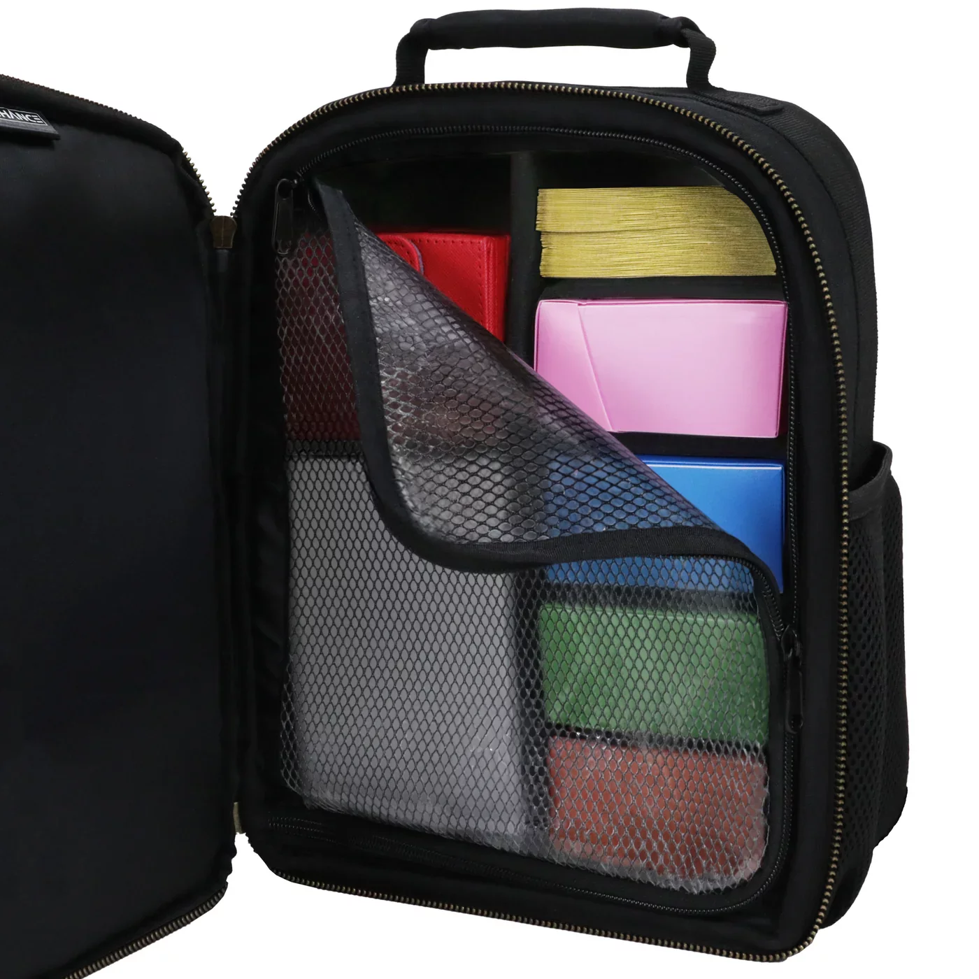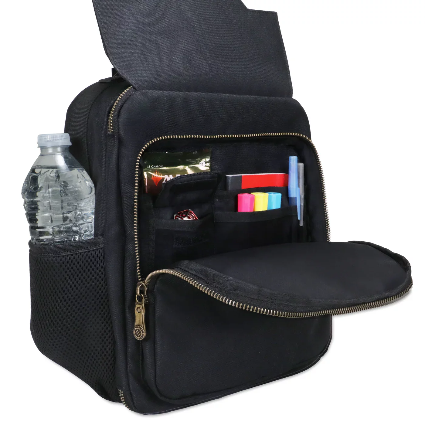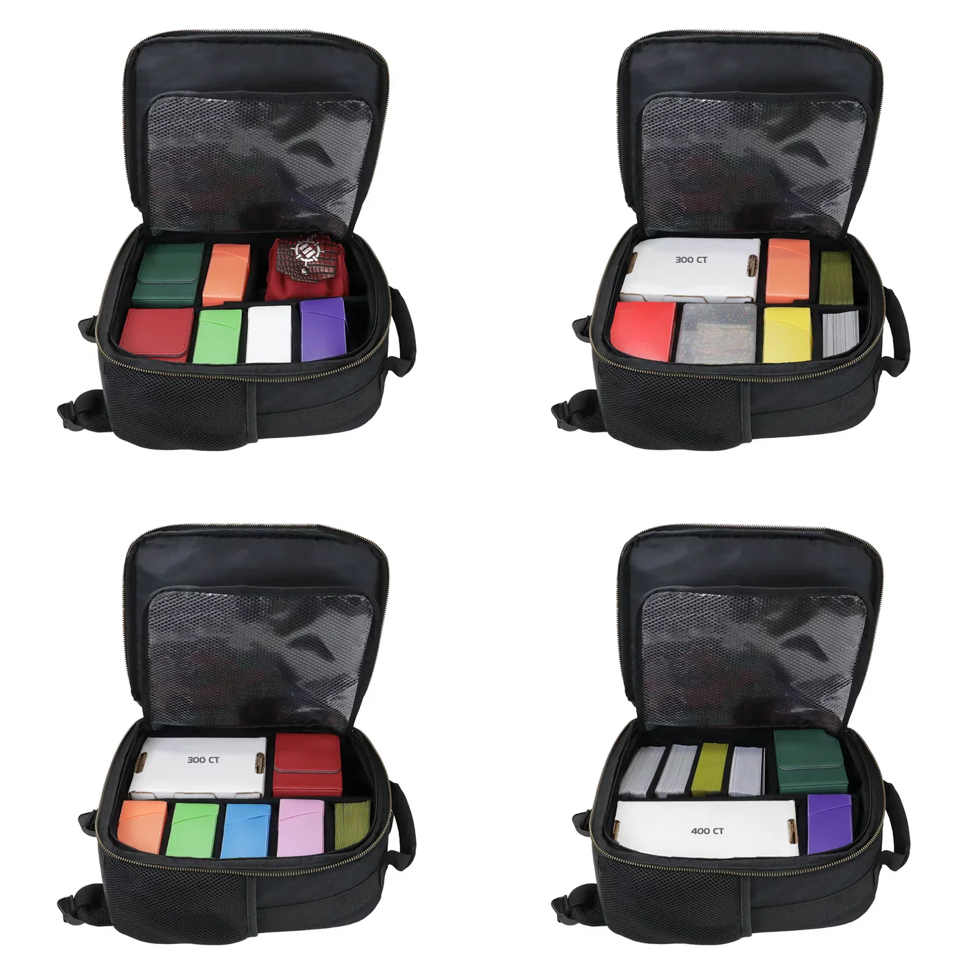 Passt das Layout genau an euren Spielstil an! Dieser Rucksack für Sammelkartenspiele ist mit verstellbaren Trennwänden ausgestattet, die eure Deckboxen, Würfeltüten und weiteres Zubehör sicher halten. Das gitterartige Card Defender Screen sorgt dafür, dass Karten und Zubehör an ihrem Platz bleiben, während die Fronttasche Platz für Booster, Notizbücher oder Tokens bietet.