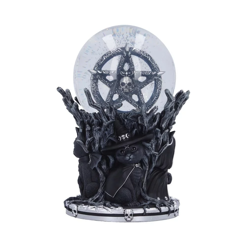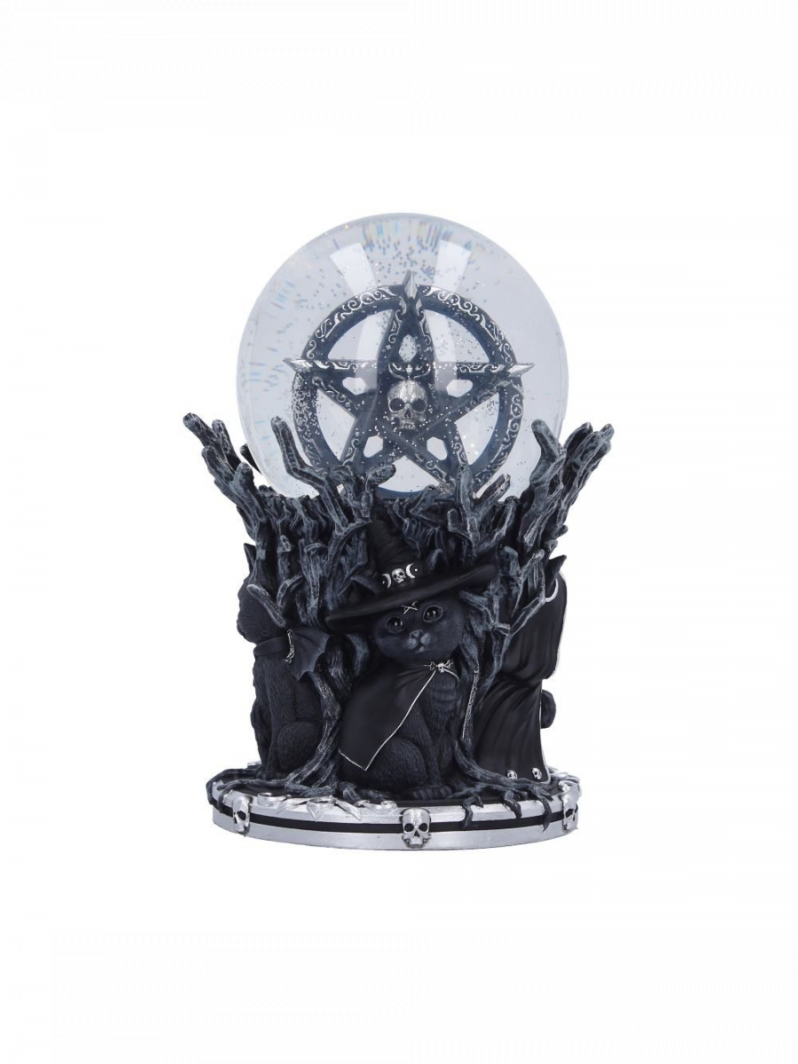 Süß düster und zugleich unheilvoll verspielt. Eine schwarze Katze, verborgen zwischen verdrehten Ästen, bewacht einen magischen Kreis mit Pentagramm, während der Glitzer in der Kugel den Eindruck eines echten, sich bewegenden Zauberspruchs erzeugt.