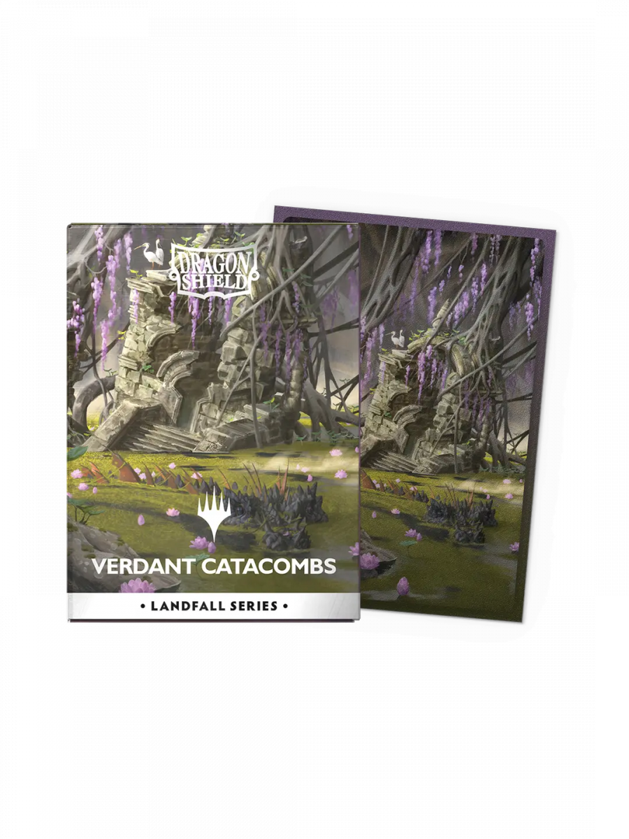 Begebt euch in überwucherte Ruinen und dunkle Winkel mit den Hüllen Dragon Shield Landfall Series – Matte Dual Sleeves Verdant Catacombs. Die atmosphärische Illustration, inspiriert von der Welt von Magic: The Gathering, versetzt eure Decks in geheimnisvolle Katakomben voller Grün und längst vergessener Geschichten.