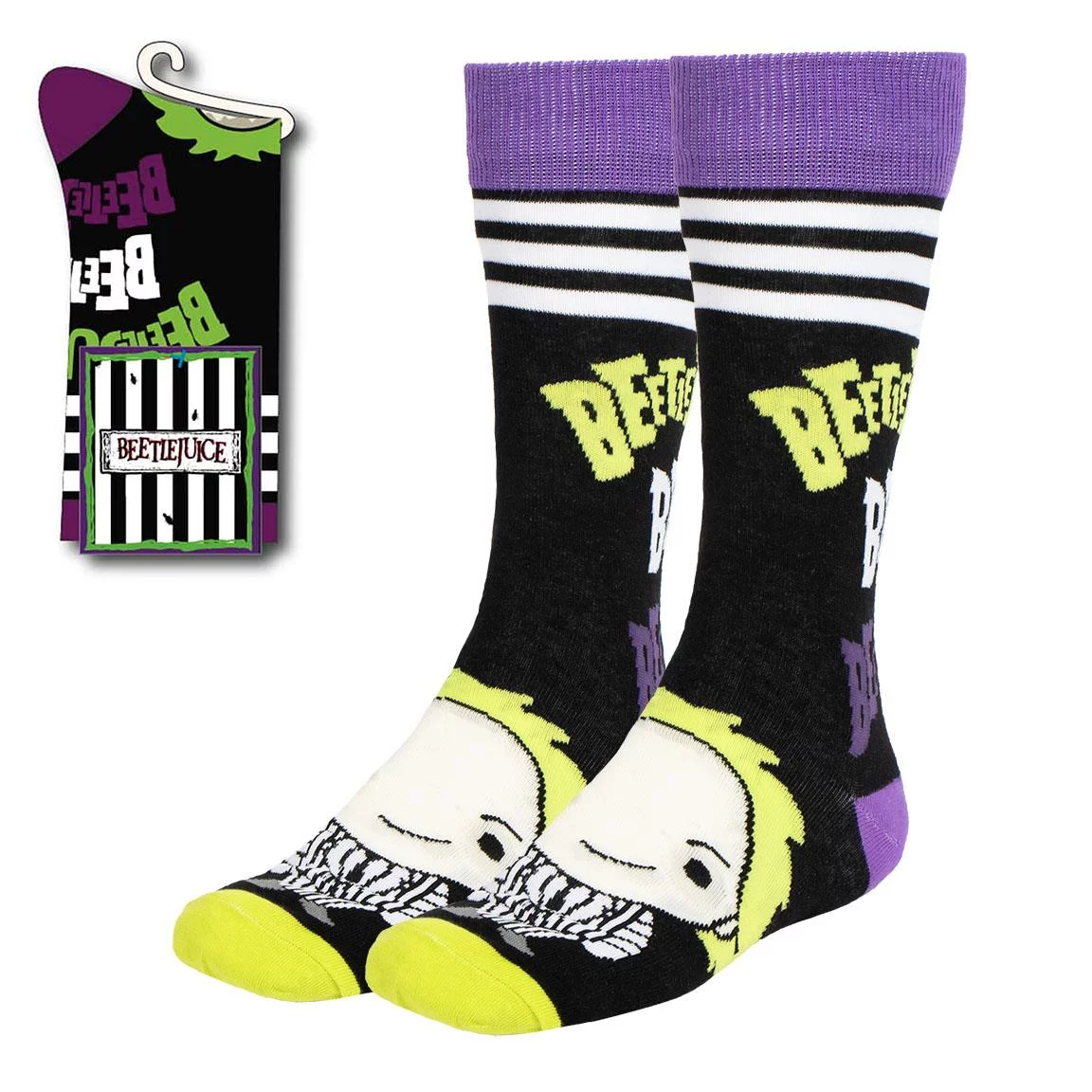 Angenehme Socken für Fans von Tim Burton, die mit dem Motiv des Kultfilms Beetlejuice verziert sind.Größe: universal (38/45)