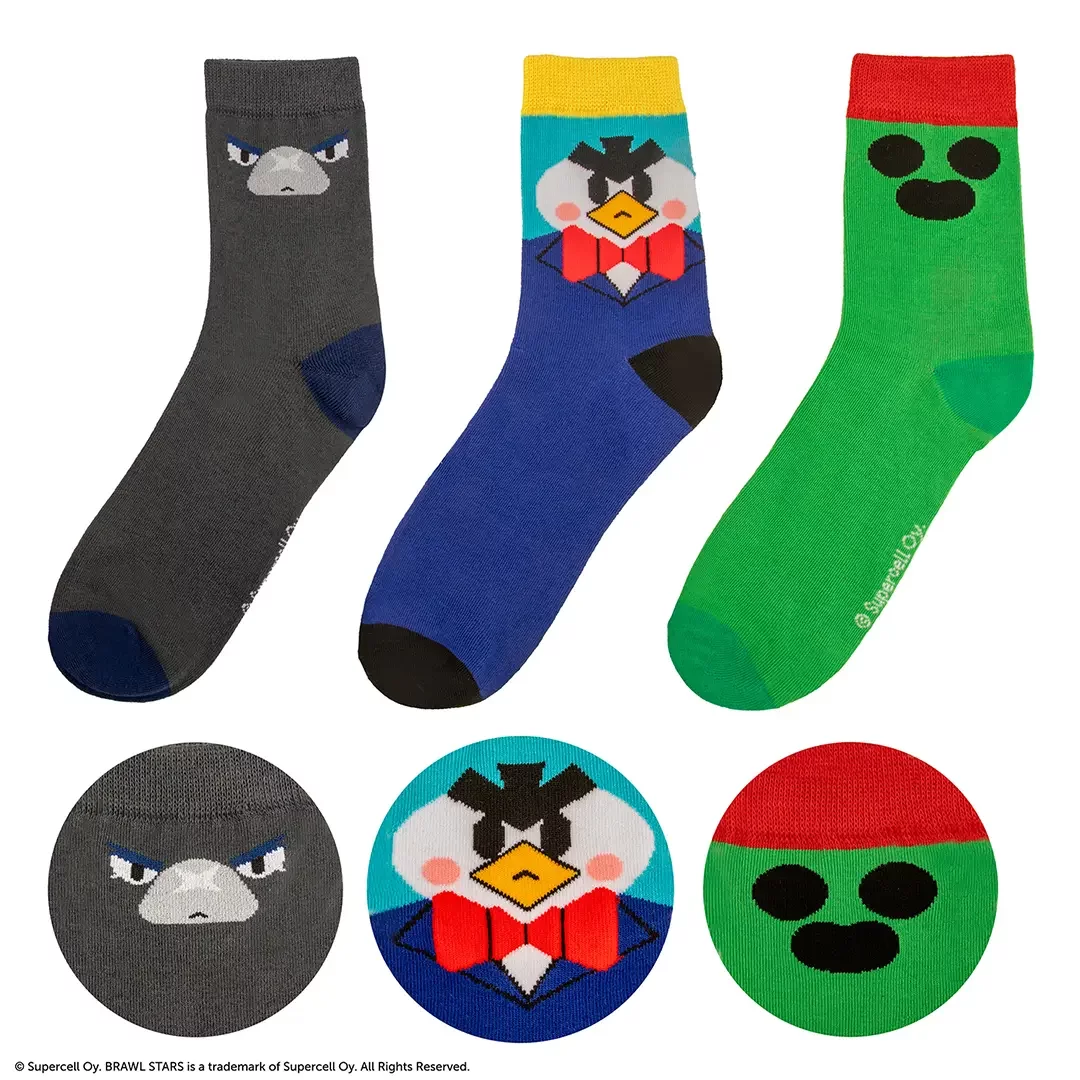 Bringt ein wenig Gaming-Energie in eure Garderobe. Dieses Set aus drei Socken von Brawl Stars zeigt ein Trio beliebter Kämpfer - Spike, Crow und Mr. P - jeder mit seinem ganz eigenen, markanten Design.