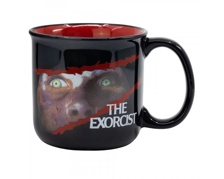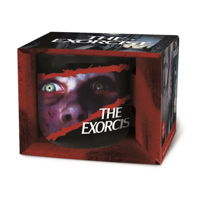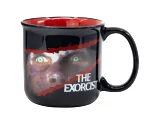 Tasse mit Motiv des klassischen Horrors Der Exorzist (The Exorcist) aus dem Jahr 1971, der eine lose Adaption des gleichnamigen Buches von William Peter Blatty ist. Die Tasse ist neben der Aufschrift auch mit dem Gesicht der besessenen Regan verziert.
