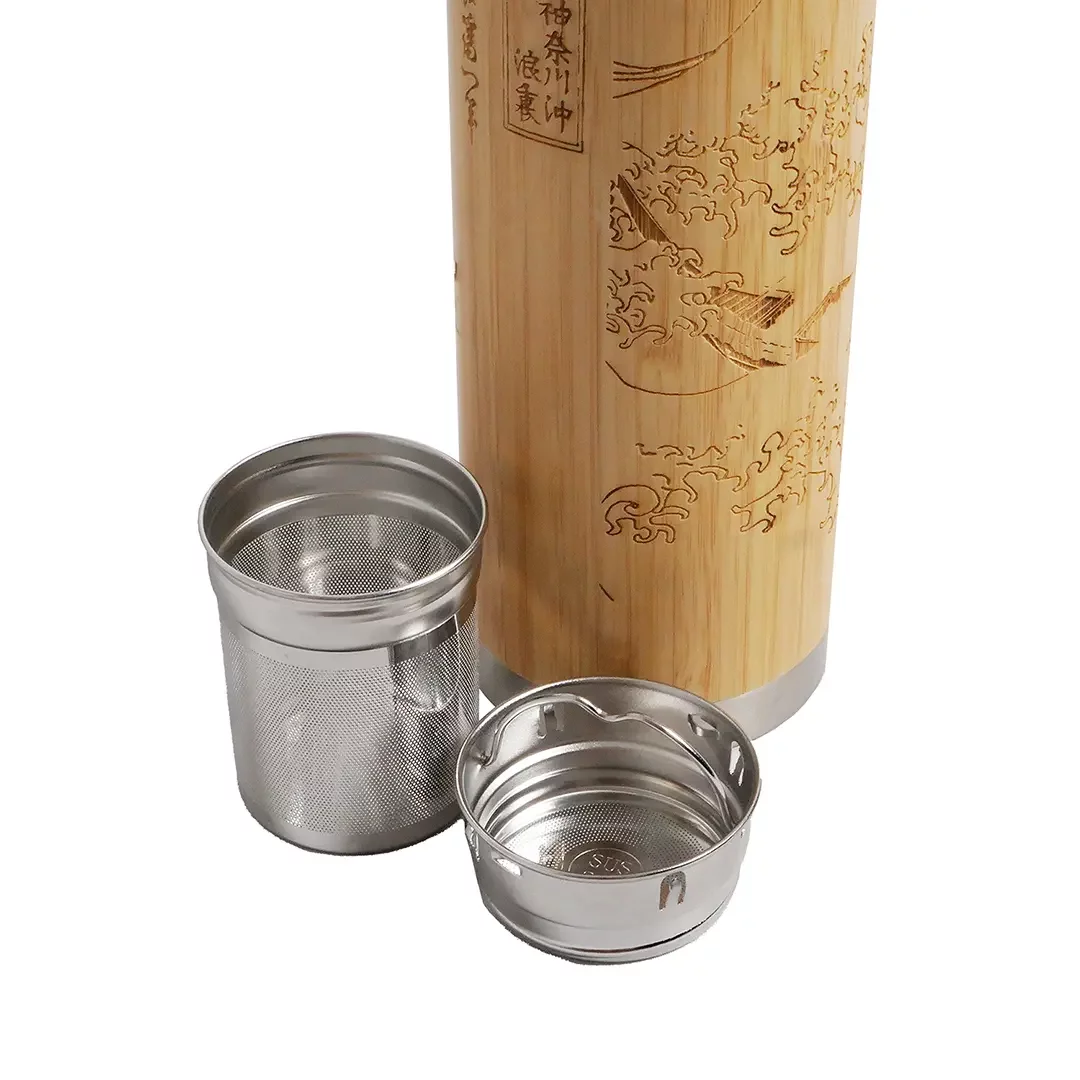 Elegante Bambusflasche mit fein graviertem Motiv des berühmten Werkes The Great Wave off Kanagawa von Hokusai – ideal für Liebhaber von Tee und Kunst.