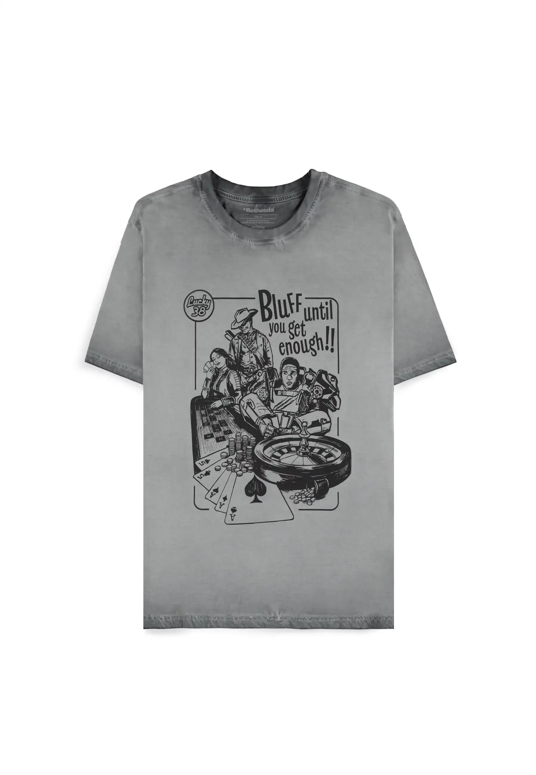 Cooles T-Shirt mit Retro-Illustration, die das Glücksspiel, den Mut und die Dreistigkeit der Ödnis perfekt einfängt. Das vom Fallout-Universum inspirierte Motiv kombiniert Kartenspiel, Chips und ikonische Figuren im Stil alter Plakate - mit nur einer Regel: Bluffen, solange es funktioniert.