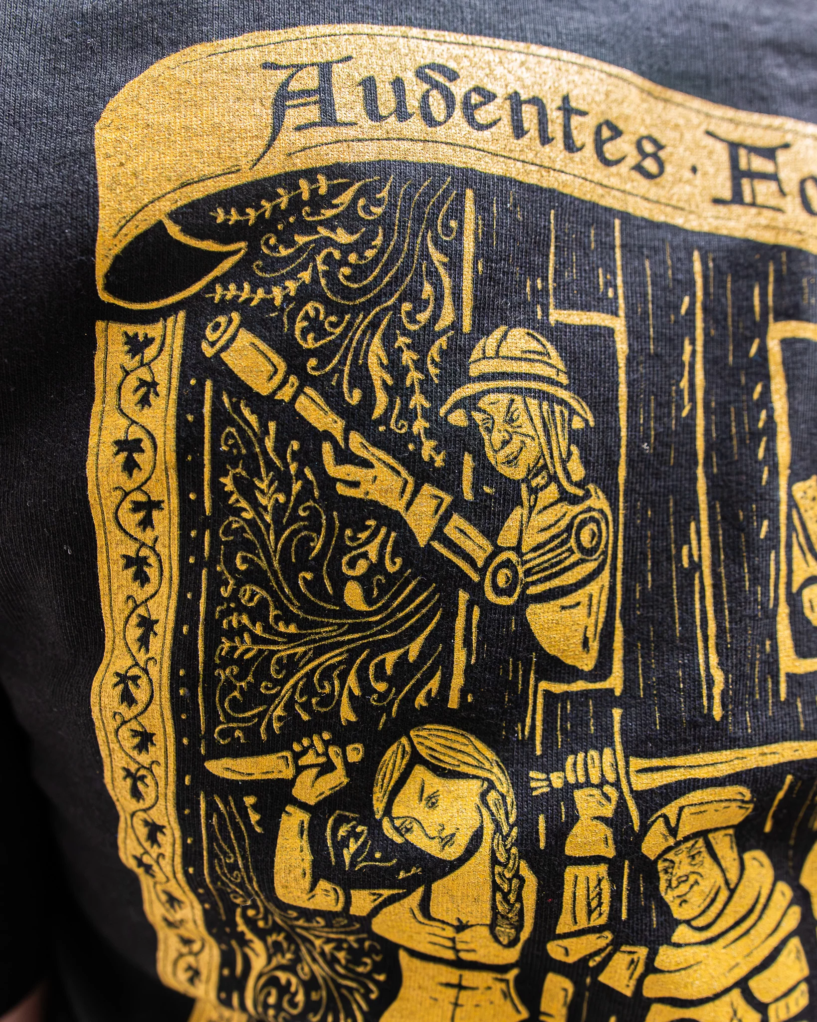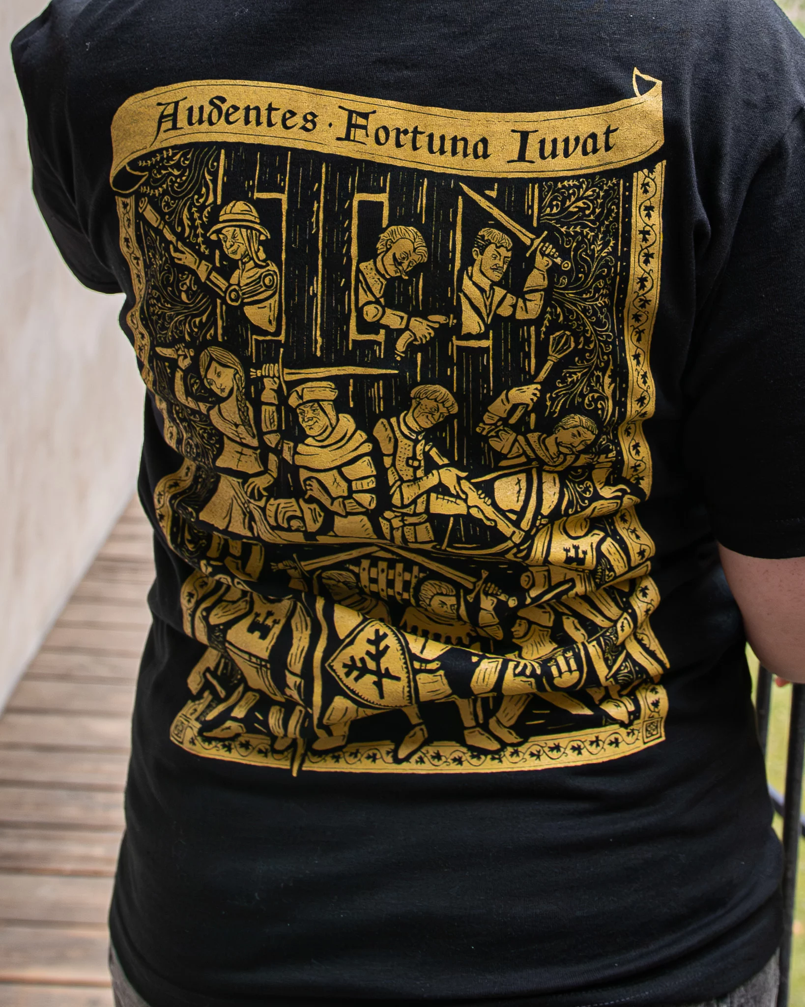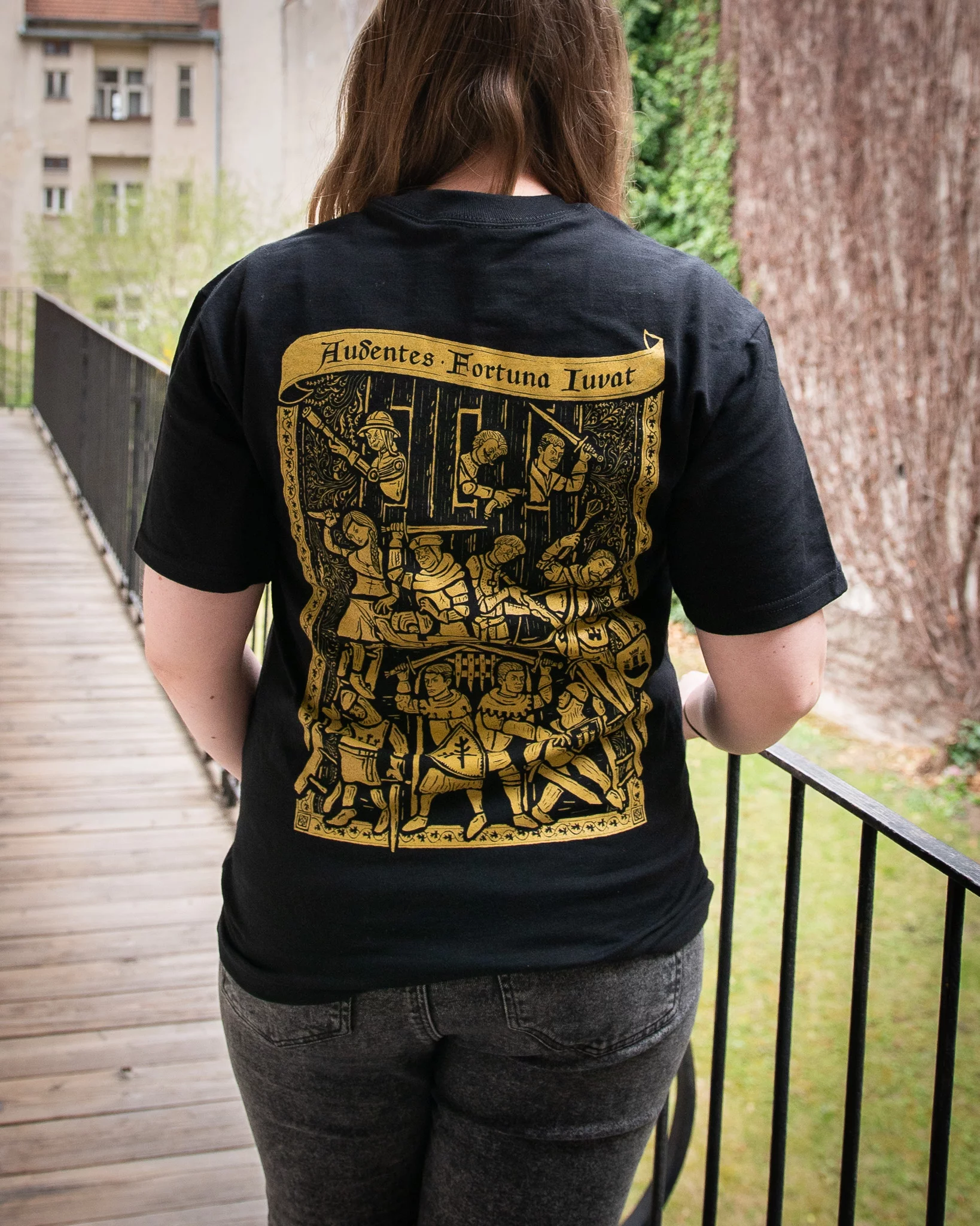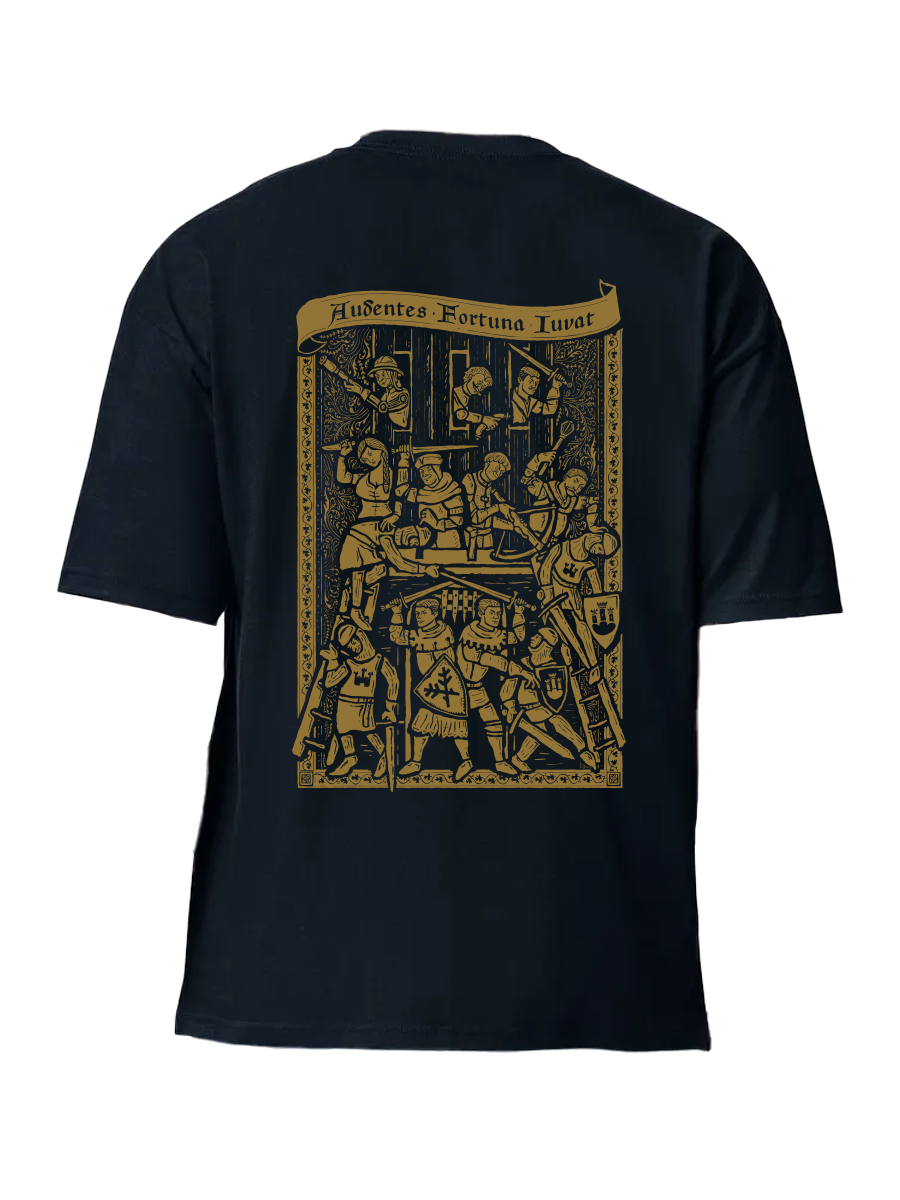 Suchdol gehört zu den Momenten, die man in Kingdom Come: Deliverance II einfach nicht vergisst. Eine Schlacht, in der sich das Blatt wendet, überall herrscht Chaos und man kann nur hoffen, dass alles irgendwie gut ausgeht. Genau diese Atmosphäre haben wir in Form einer von mittelalterlichen Holzschnitten inspirierten Illustration auf das Rückenteil des T-Shirts übertragen, auf der alle beliebtesten Helden vertreten sind. Je länger man sie betrachtet, desto mehr Details entdeckt man.