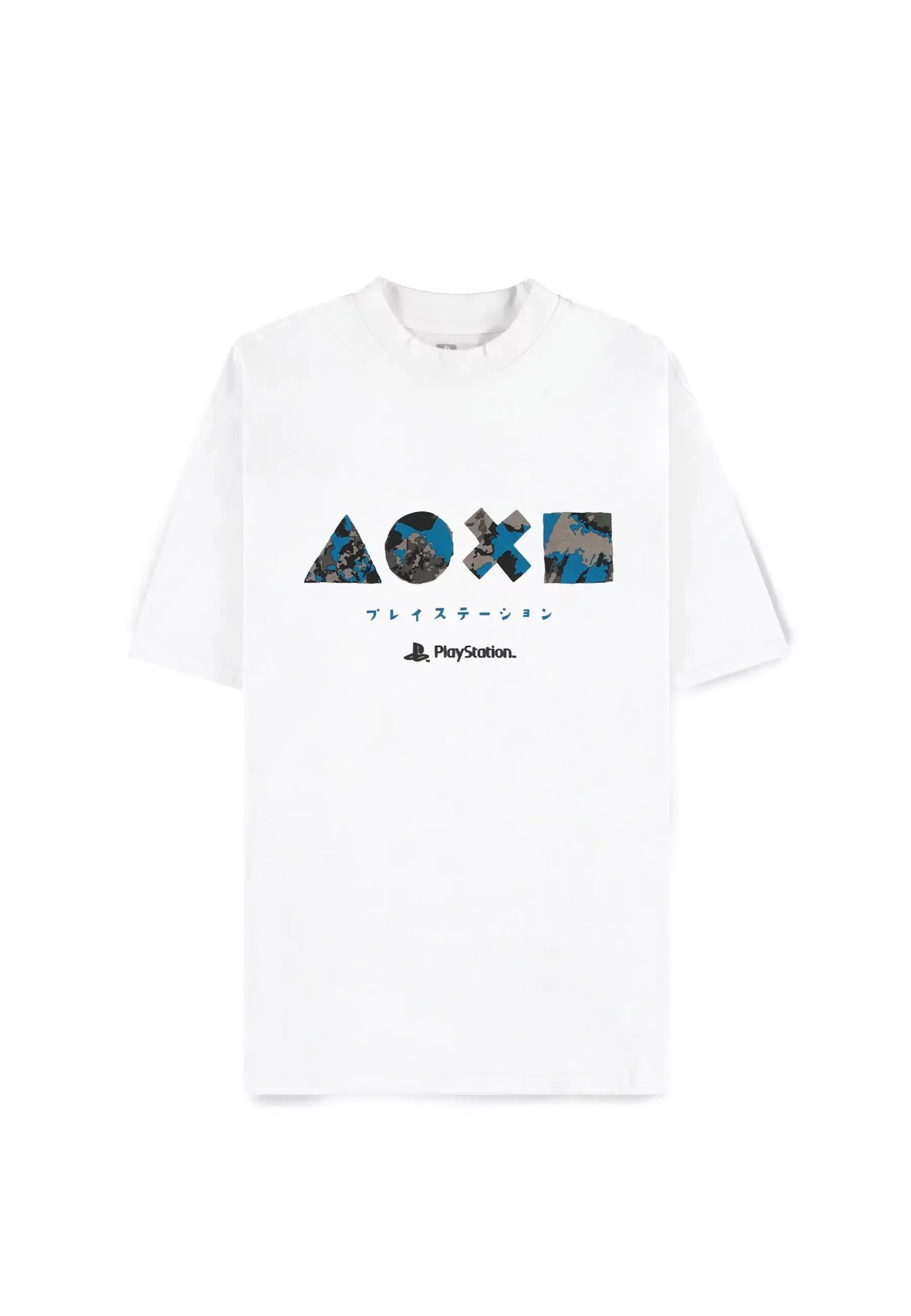 Das T-Shirt PlayStation – Icons stellt die legendären Symbole △ ○ × □ in den Mittelpunkt – in einer modernen, markanten Ausführung, ergänzt durch den japanischen Schriftzug プレイステーション. Das klare Design auf weißem Hintergrund lässt das Wichtigste besonders zur Geltung kommen: Eure Liebe zu PlayStation.