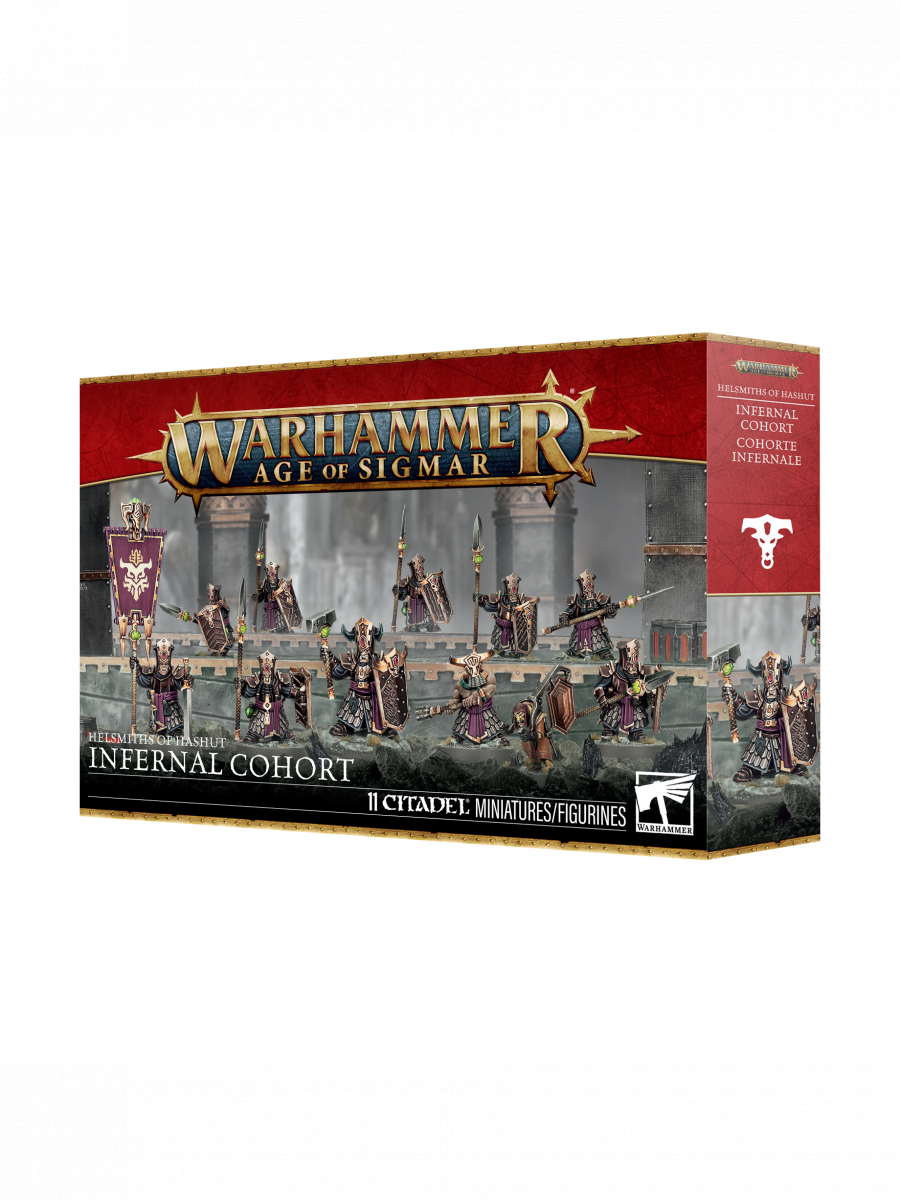 Entfesselt die brennende Wut der Infernal Cohort, der unerbittlichen Infanterie der Helsmiths of Hashut, auf dem Schlachtfeld. Diese Kriegsschmiede aus dem Höllenschmelzofen marschieren im Rhythmus von Eisen und Flammen, gehüllt in schwere Rüstung und bewaffnet mit tödlichen Speeren, die von dämonischer Macht lodern.