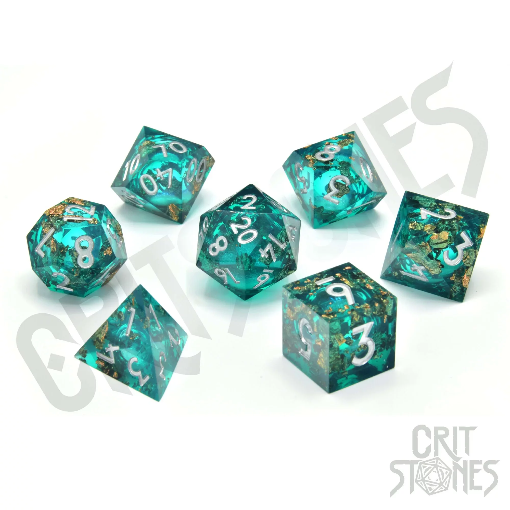 Forest Fountain Liquid Core Set besticht durch ein durchsichtiges Smaragd-Finish mit flüssigem Kern, der sich bei jedem Wurf wie lebendig bewegt. Goldgrüne Glitzerpartikel verleihen das Gefühl, dass die Magie der Natur in den Würfeln fließt.