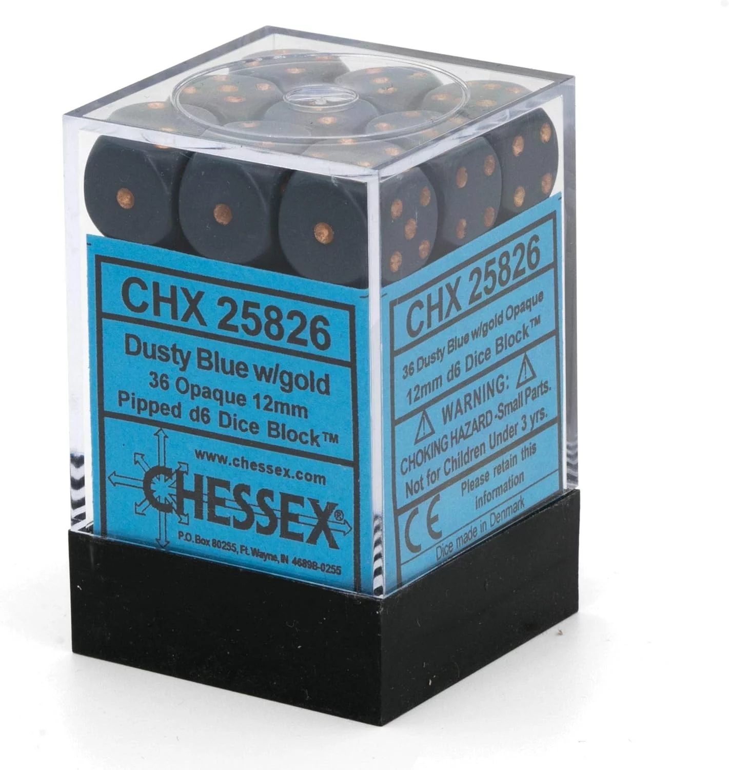 Das Chessex-Opaque-Würfelset – Dusty Blue (36 Stück) bietet eine elegante Blau-Gold-Kombination, ideal für Brett- und RPG-Spiele.