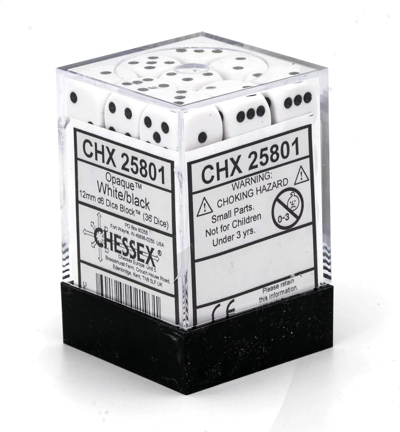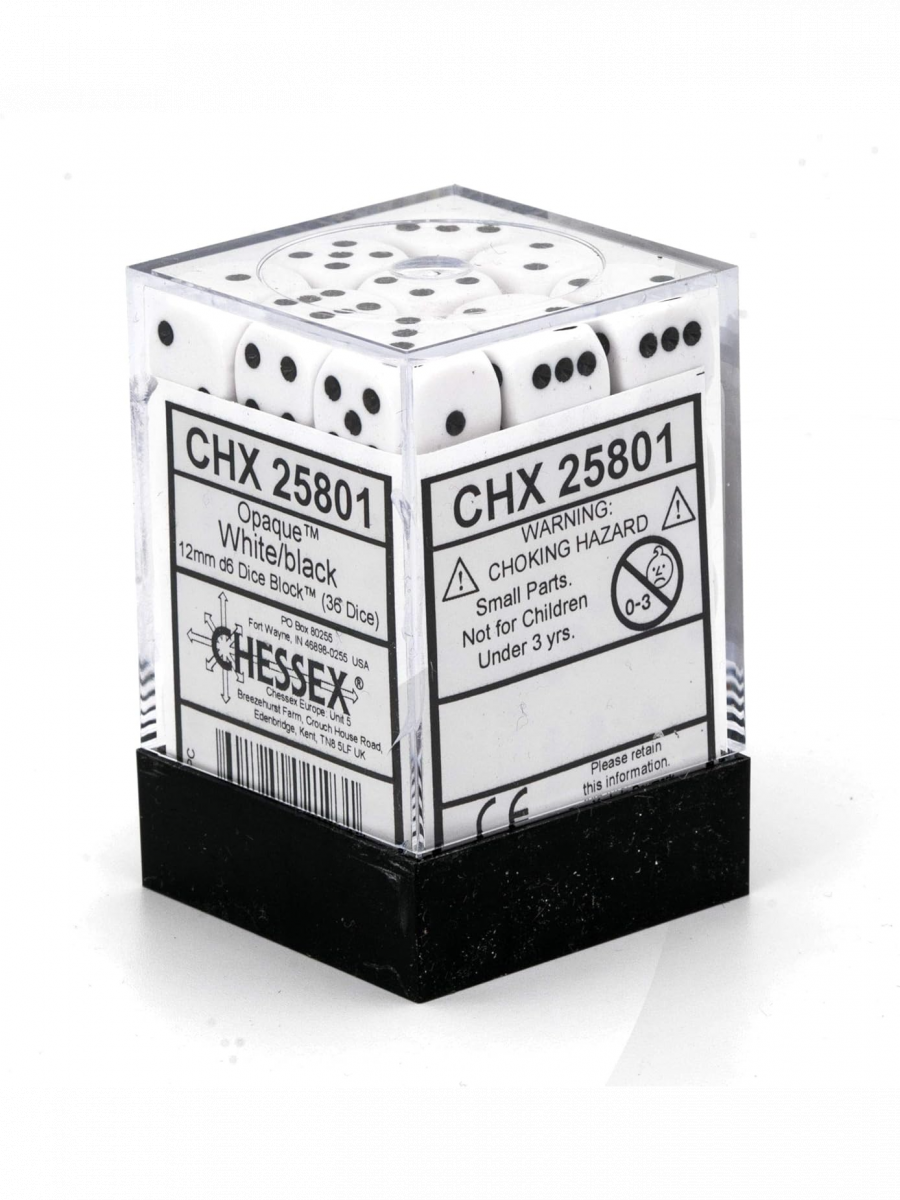 Das Set aus sechsseitigen Würfeln Chessex Opaque – White (36 Stück) im klassischen weißen Design mit schwarzen Punkten ist die ideale Wahl für jeden Fan von Brett- und Tischspielen.